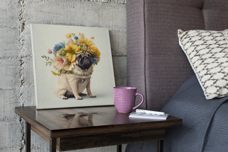 The floral arrangement is a masterful blend of various species, including the bold sunflower, delicate bluebells, and soft-hued roses. The lifelike quality of these flowers creates a striking contrast with the Pug's smooth, light coat, making this Pug Decor piece a captivating addition to any room.