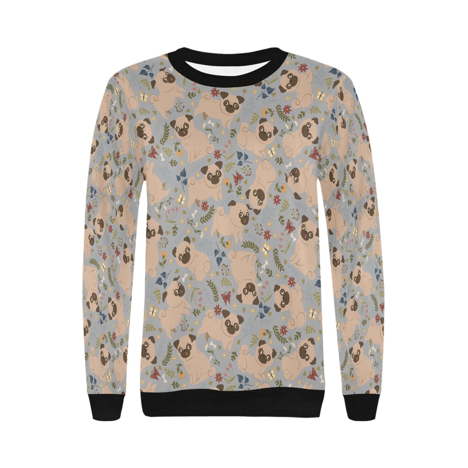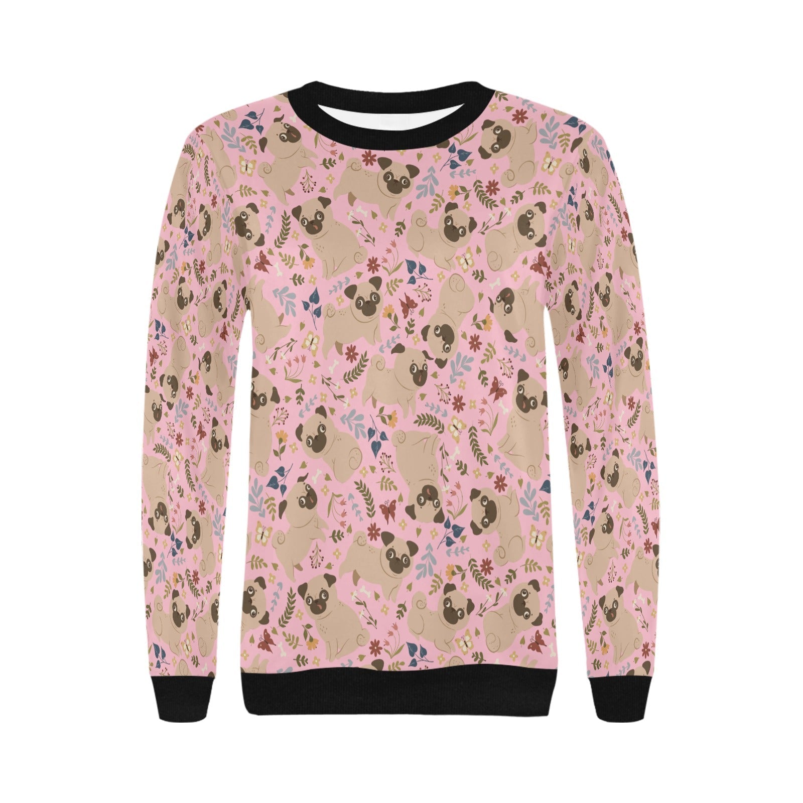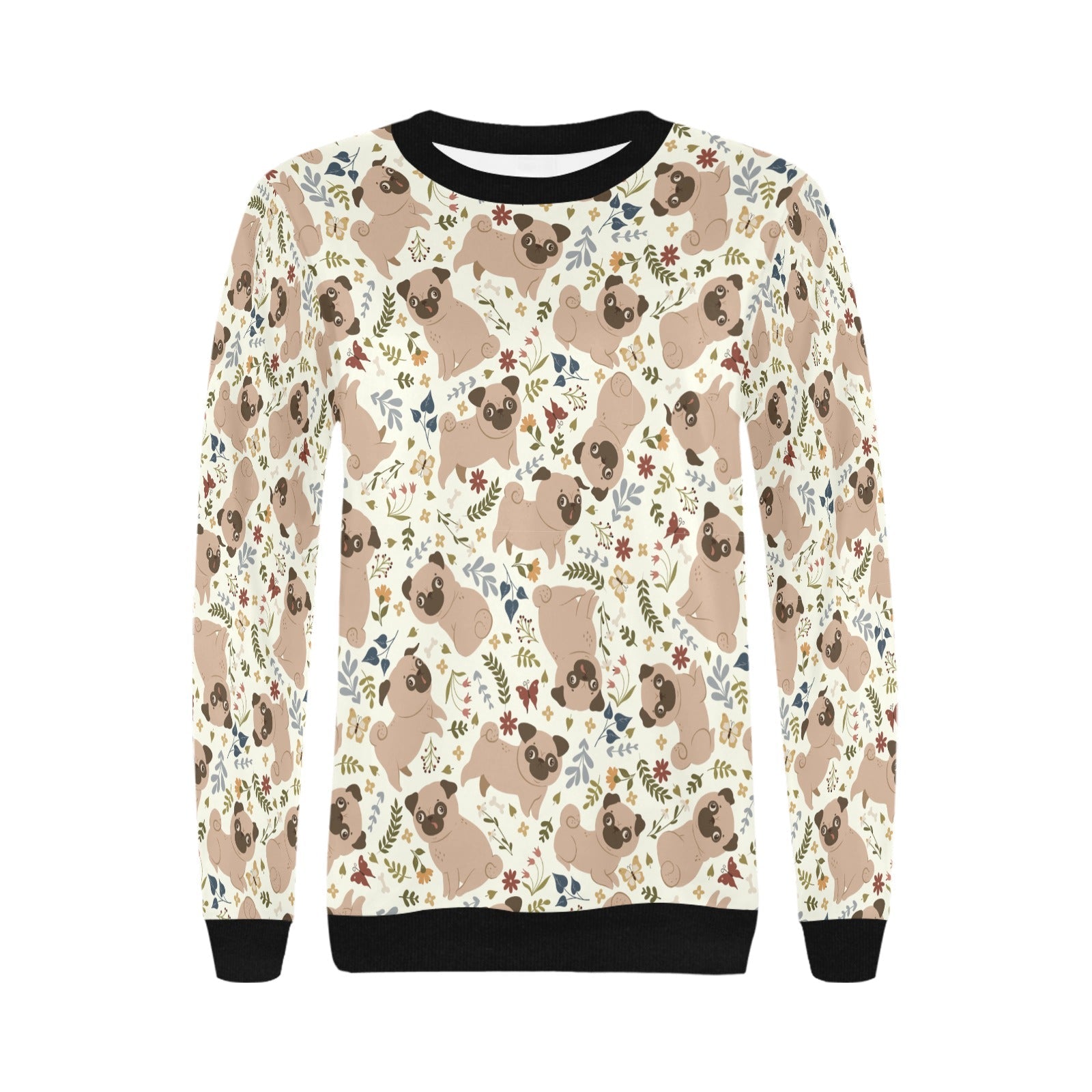 Featuring adorable Pugs sitting and playing against a backdrop of soft floral accents, this sweatshirt radiates warmth and joy.