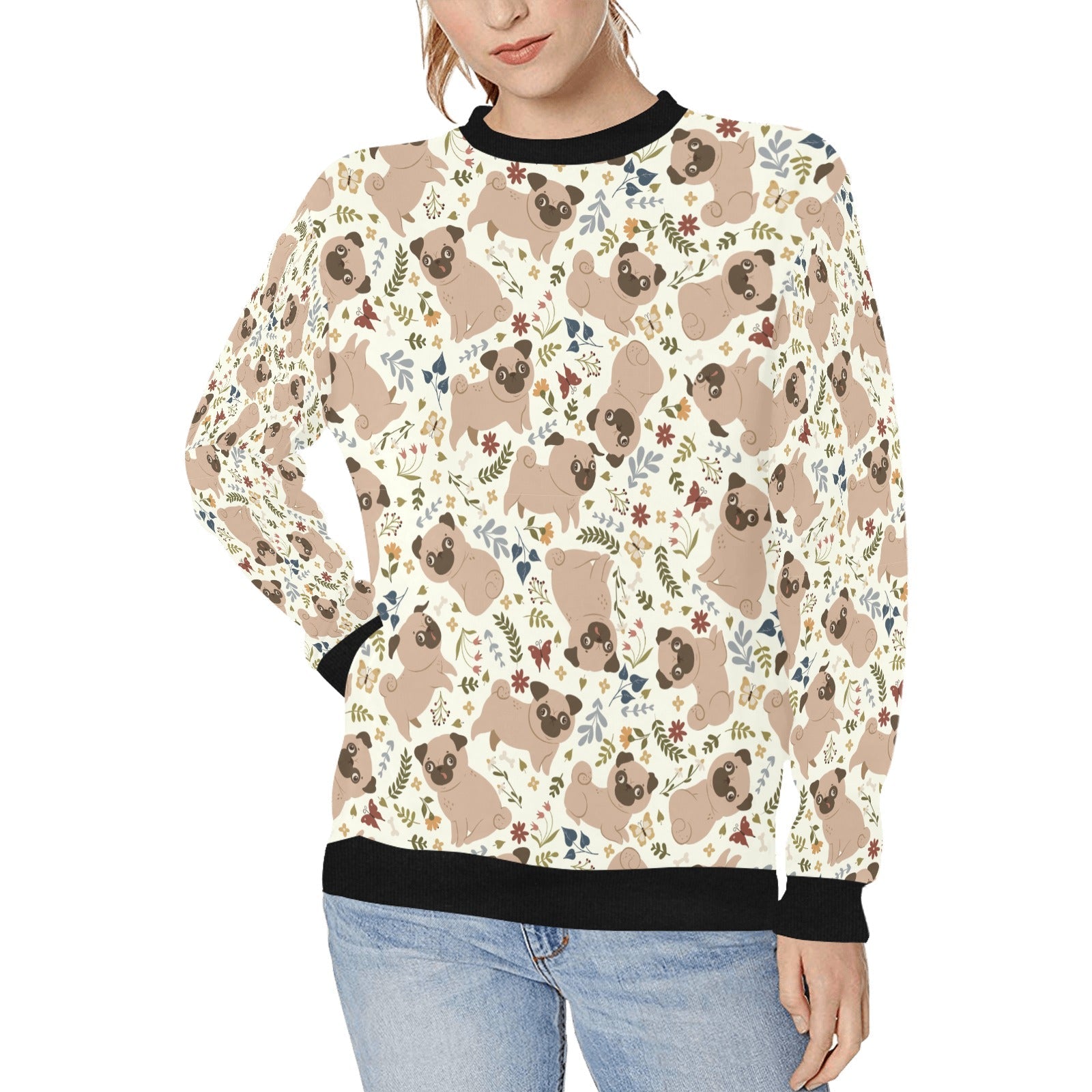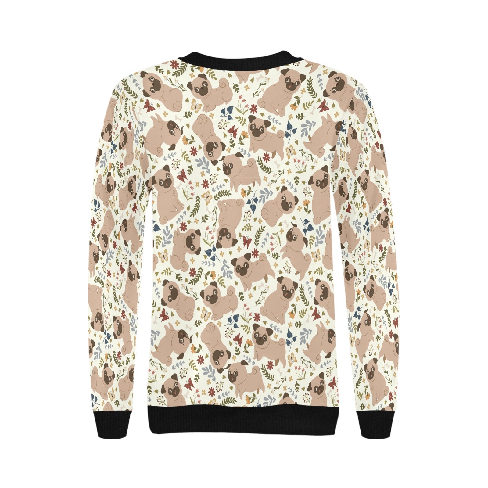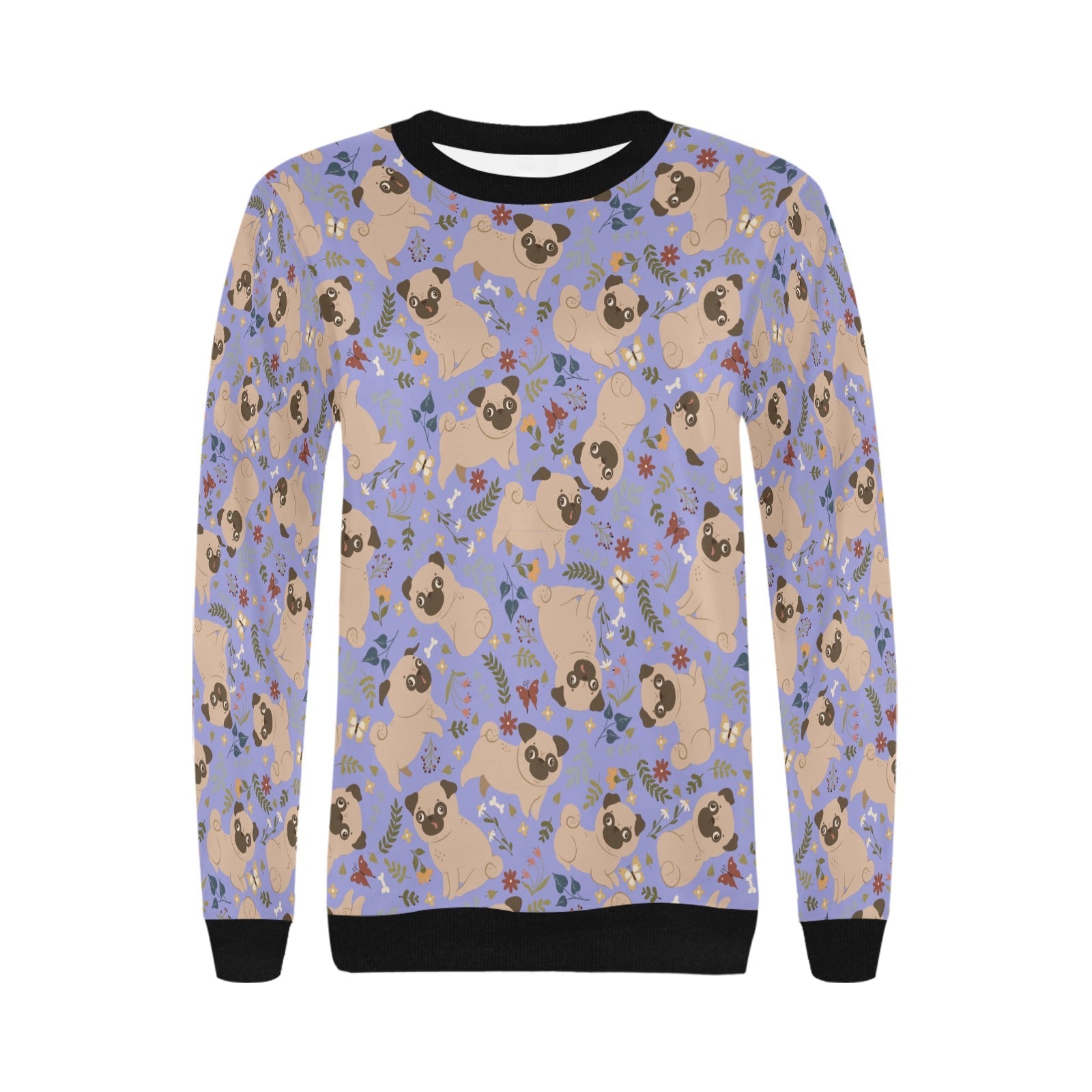 Featuring adorable Pugs sitting and playing against a backdrop of soft floral accents, this sweatshirt radiates warmth and joy.