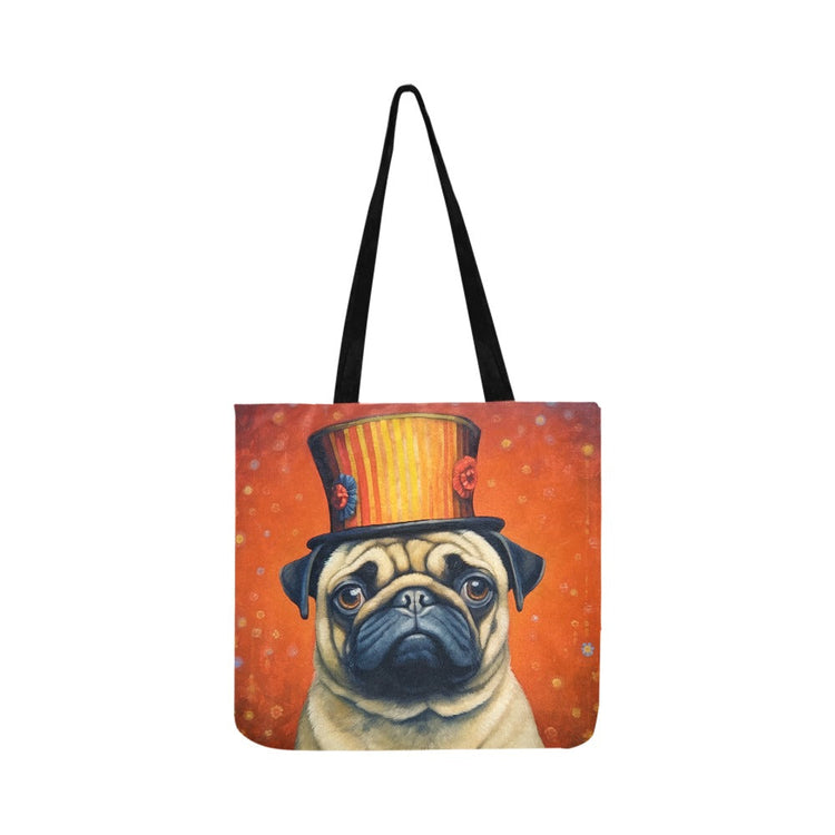 This tote bag features the charismatic "Circus Ringmaster Pug: The Showstopper's Gaze," capturing the essence of the Pug’s personality—its command of attention through their endearing presence.