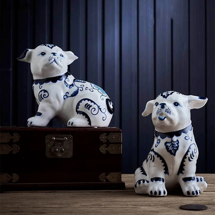 These hand-painted blue and white porcelain pug statues are a must-have for dog lovers and art enthusiasts. The intricate design captures the essence of traditional Chinese porcelain patterns.
