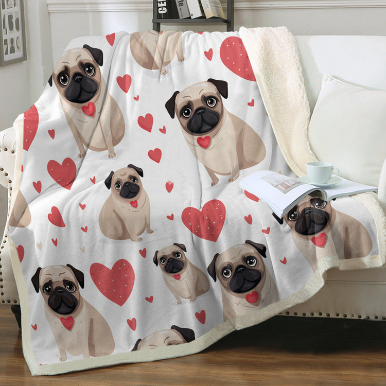 Designed with both Pugs and people in mind, this blanket is far more than just a cozy layer. It's a statement of adoration for one of the most charming and lovable breeds out there. Showcasing a heartwarming design featuring adorable Pugs and red hearts, this fleece blanket embodies the joy and companionship that comes with having a Pug as a furry family member.