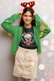 Made from high-quality cotton fabric, this t-shirt offers superior comfort, breathability, and durability for everyday wear. The highlight of this t-shirt is the adorable design featuring a Pug wearing a red Santa hat and reindeer horns, nestled inside a Christmas wreath adorned with a red ribbon bow and golden bells.