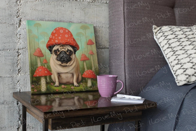 The Pug's whimsy is further accentuated by a bright red mushroom cap, lending a playful, storybook quality to the piece. Set against a background of smaller red mushrooms, reminiscent of the iconic fly agaric with their vibrant red caps and white spots, the design creates an enchanting and lighthearted atmosphere.