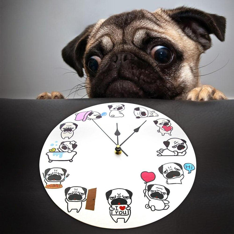 Image of Pug clock on the wall with 12 cutest Pug designs