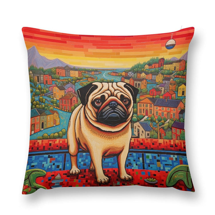 Featuring the captivating artwork "Pug Overlook: Guardian of the Vibrant Vale," this plush pillow case celebrates the cherished Pug against a whimsical town at dusk.