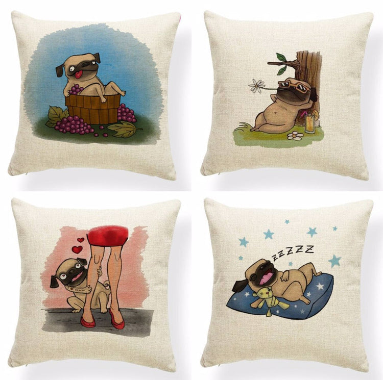 Featuring the cutest Pug's day out designs, including Pug at the Winery, Snowman Pug, Jester Pug, Picnic Pug, Surfing Pug, Christmas Pug, Lover Pug and finally Sleeping Pug. Just buy one or mix and match a few - these cutest throw pillows for Pug lovers are sure to make you smile!