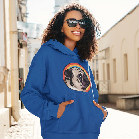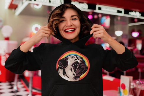 The highlight of this hoodie is the retro-inspired design featuring a Pug against a colorful background of rainbow circles. The vibrant hues and playful patterns add a touch of nostalgia and whimsy to your outfit. It's a statement piece that showcases your love for Pugs and embraces a fun and carefree spirit.