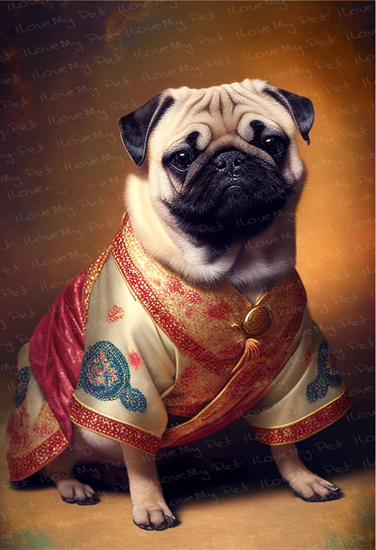 This exquisite piece of art captures the essence of regal splendor, featuring a noble Pug draped in finery reminiscent of the opulent courts of ancient empires. The fawn-coated Pug, with its expressive dark eyes and dignified poise, contrasts beautifully against the intricate patterns and motifs of its luxurious robe.