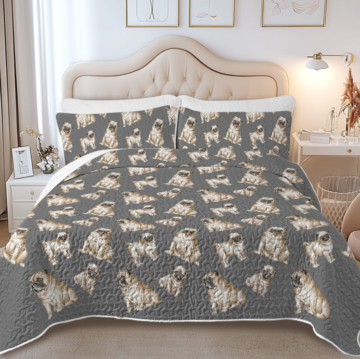 Watercolor Symphony Fawn Pugs Quilted Bedding Set