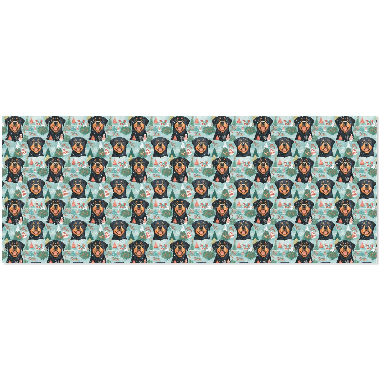 Each roll showcases these beloved dogs against a backdrop of frosty landscapes, adorned with miniature Christmas trees and delicate snowflakes. The rich, warm tones of the Rottweilers' coats harmonize beautifully with the serene winter scenery.