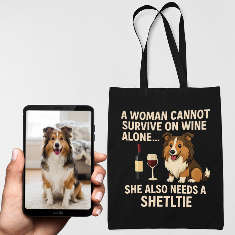 Personalized “A Woman Cannot Survive on Wine…” Custom Sheltie Tote Bags