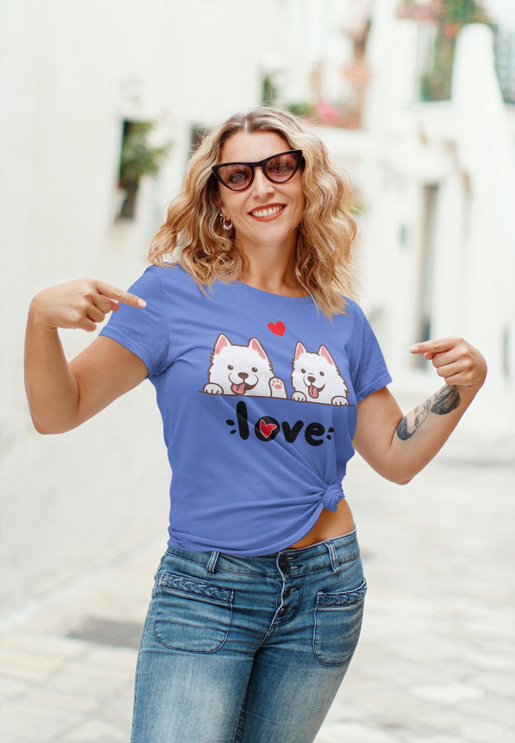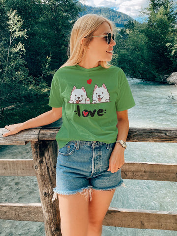 This delightful t-shirt showcases two super cute Samoyeds, surrounded by love and adorned with a floating heart. The design is incredibly adorable, capturing the essence of these fluffy and friendly dogs. Every time you wear this t-shirt, it will bring a smile to your face and remind you of the deep bond you share with Samoyeds.