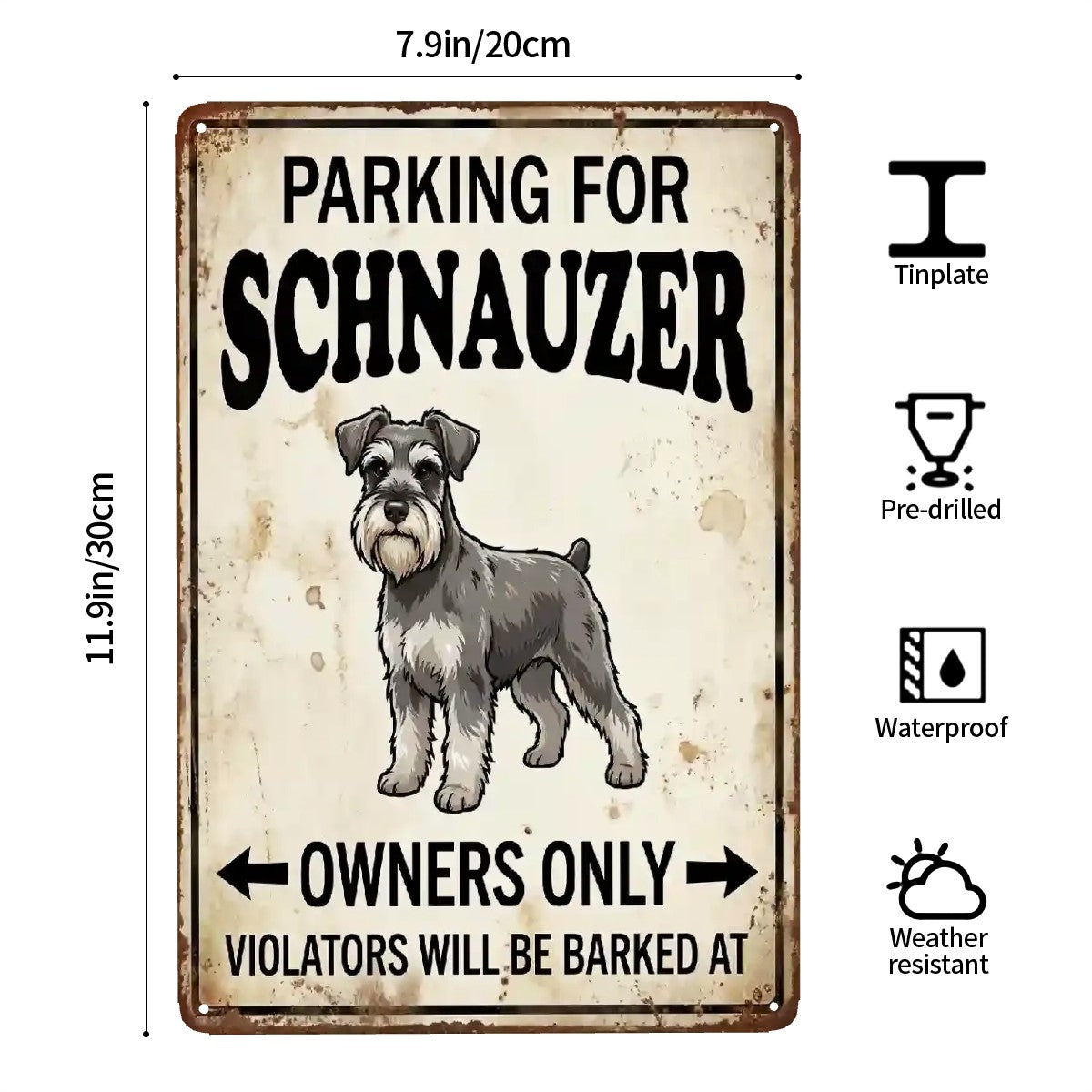 This tinplate sign from iLoveMy.Pet turns everyday parking into a heartwarming tribute to a Schnauzer you adore. Upload a photo to match your dog’s coat color, and give Gifts as Loyal as Your Best Friend.