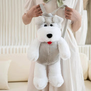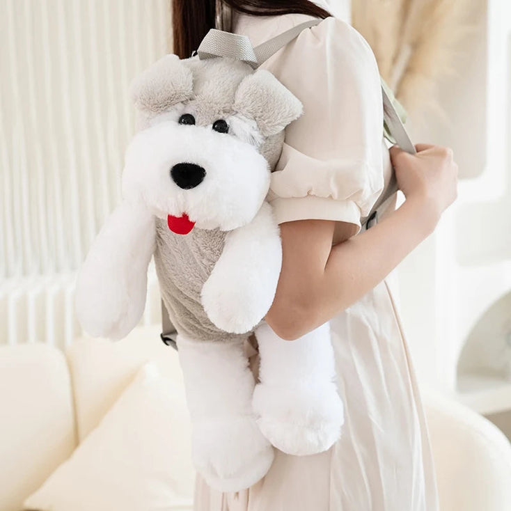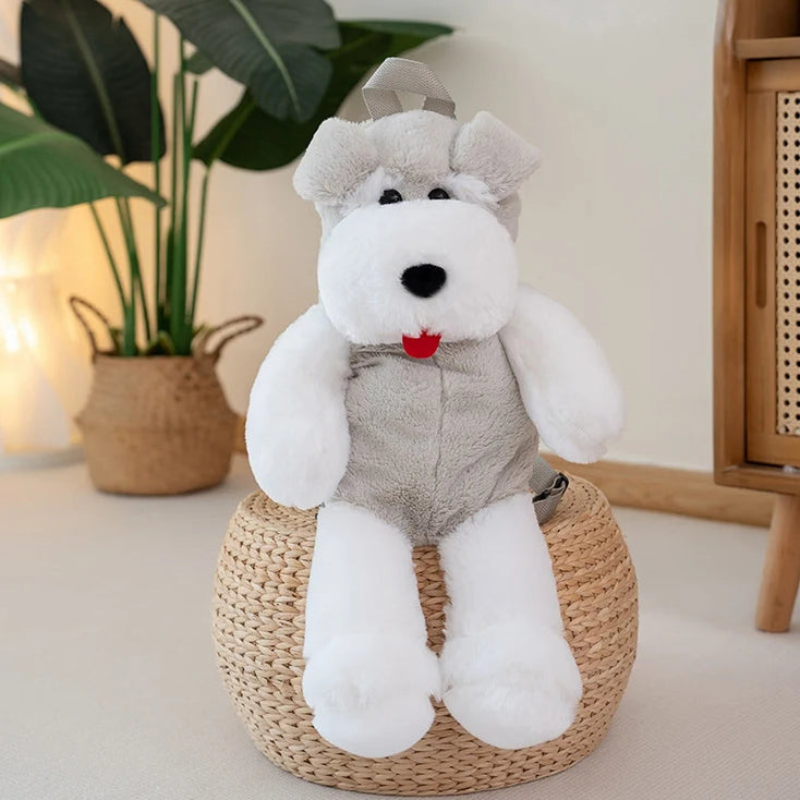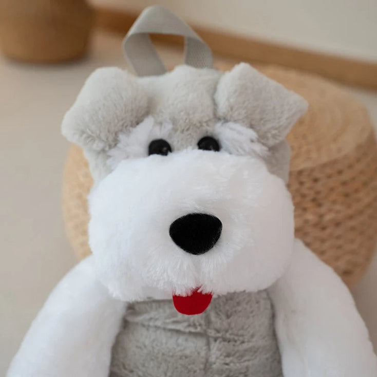 This adorable backpack is crafted from soft plush material, making it irresistibly cuddly. Designed to resemble a Schnauzer, it features a friendly face with stitched eyes, nose, and mouth, and floppy ears that add to its charm.
