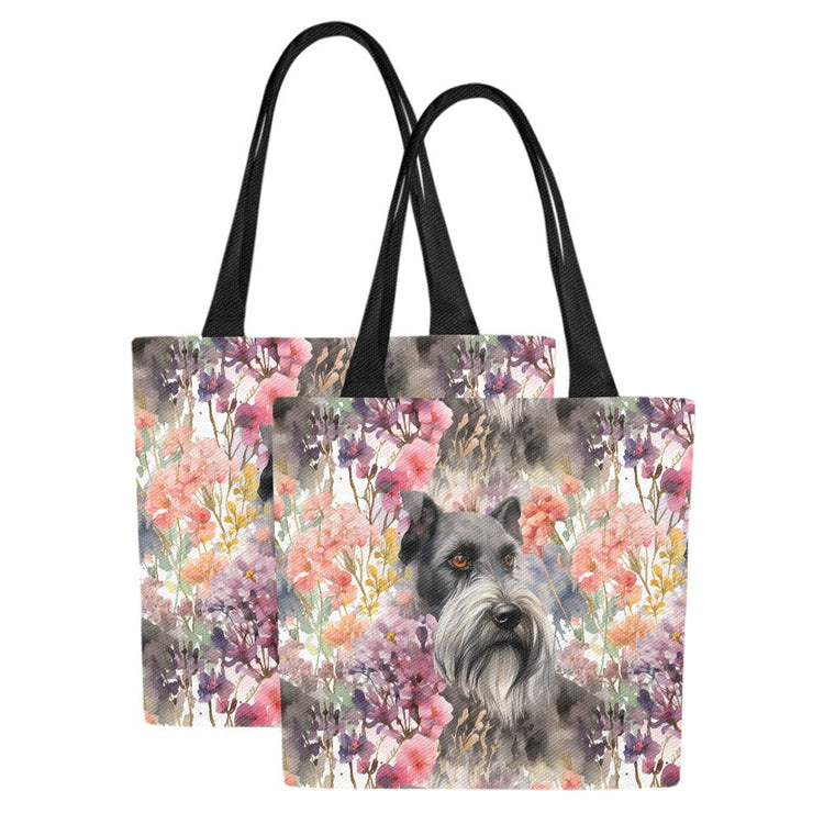 Introducing the Floral Harmony Schnauzer Splendor Large Canvas Tote Bags - a set of two, embodying the elegance and grace of the Schnauzer breed.