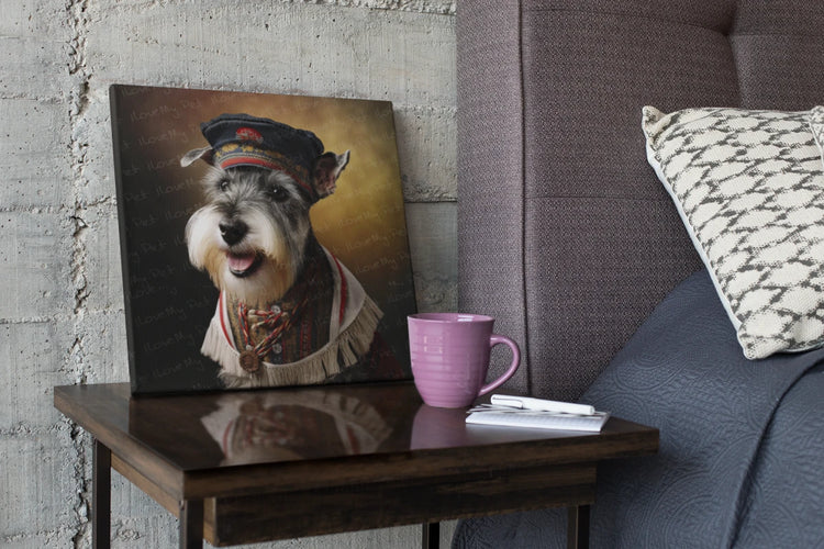 Schnauzer Artwork isn't just a portrait; it's a playful yet respectful homage to the past, intertwining canine charm with historical fashion. It invites viewers to immerse themselves in the imagined tales of this Schnauzer, perhaps as a loyal companion to a decorated general or as a steadfast mascot in historical regiments.
