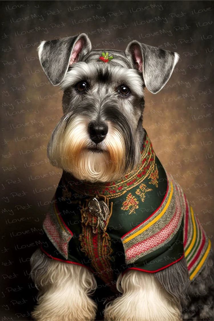 This unique piece of art masterfully blends the noble elegance of the Schnauzer with the rich sartorial history of Germany. Witness a serene and dignified Schnauzer, adorned in a traditional German outfit that mirrors the vibrant and intricate designs of German folk costumes.
