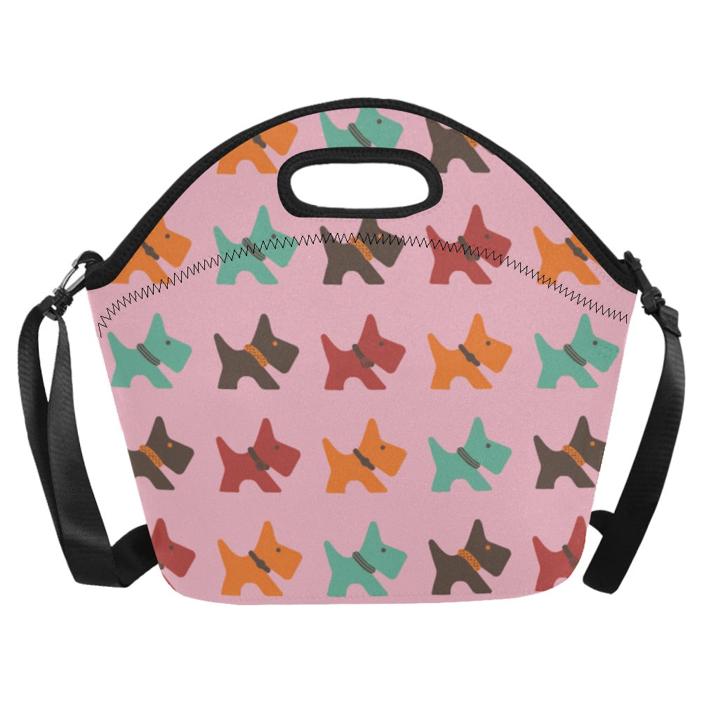 Brighten your lunch hour with our Vibrant Colorful Schnauzer Neoprene Lunch Bag, a perfect blend of style and functionality! This eye-catching bag features a playful pattern of stylized Schnauzers, each adorned with a unique bearded face and colorful striped collar.
