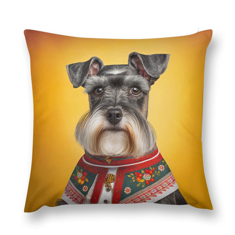 This plush pillow case features a regal Schnauzer, a breed celebrated for its robust build, wiry coat, and unmistakably aristocratic beard and eyebrows, all brought to life in an artwork that transcends time.
