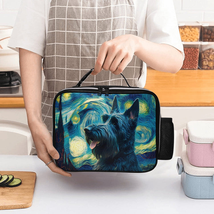 The Terrier's jet-black coat contrasts strikingly with the dynamic blues and yellows of the night sky, embodying a sense of calm and intelligence amidst the impressionistic chaos. Its perked ears and keen gaze reflect the alertness and noble character that Scottish Terrier enthusiasts adore, making this lunch bag not just a utility but a piece of art.