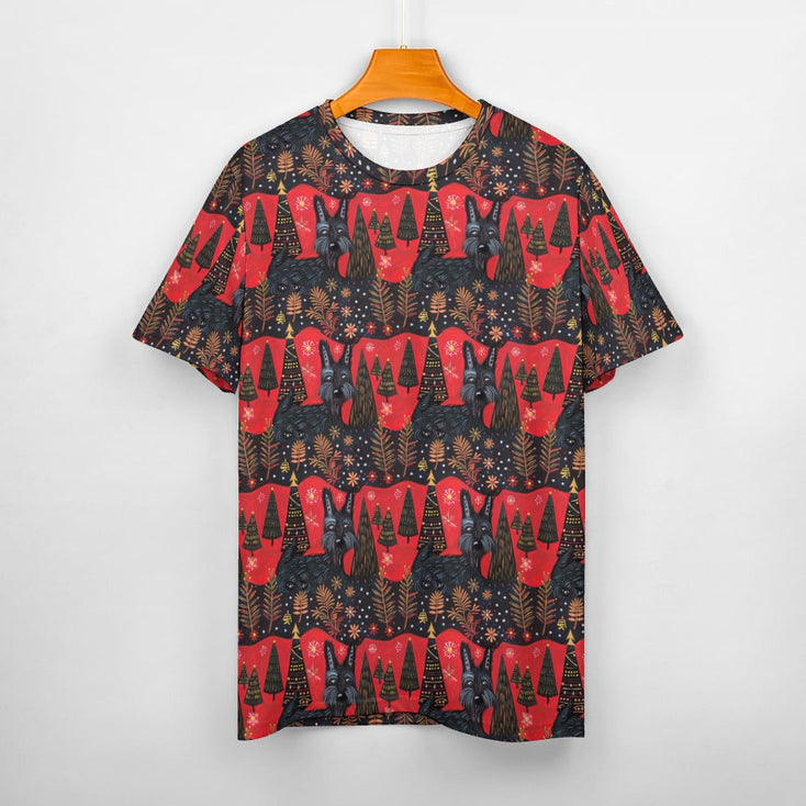 Bathed in dramatic red hues, this t-shirt captures the holiday spirit with a charming Scottish Terrier design. The stark black fur of the Scottie contrasts beautifully against the crimson backdrop, making it a standout piece for any festive occasion.