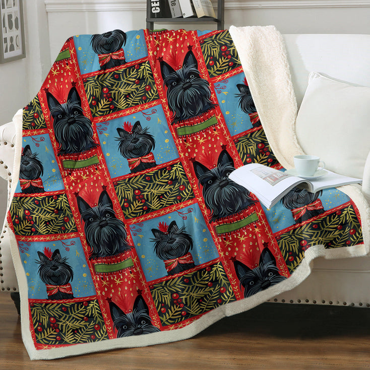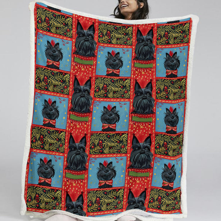 This blanket is a vibrant tribute to the Scottish Terrier, framed by panels of festive joy. The terrier's dignified gaze captures the viewer, a silent guardian amid the holiday revelry.