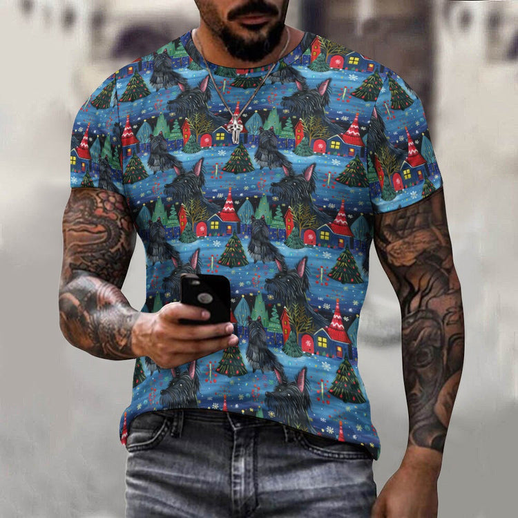 Celebrate the festive season with a touch of whimsy and warmth with our Starlight and Snowflakes Scottie Dog Christmas Men's Cotton T-Shirt.
