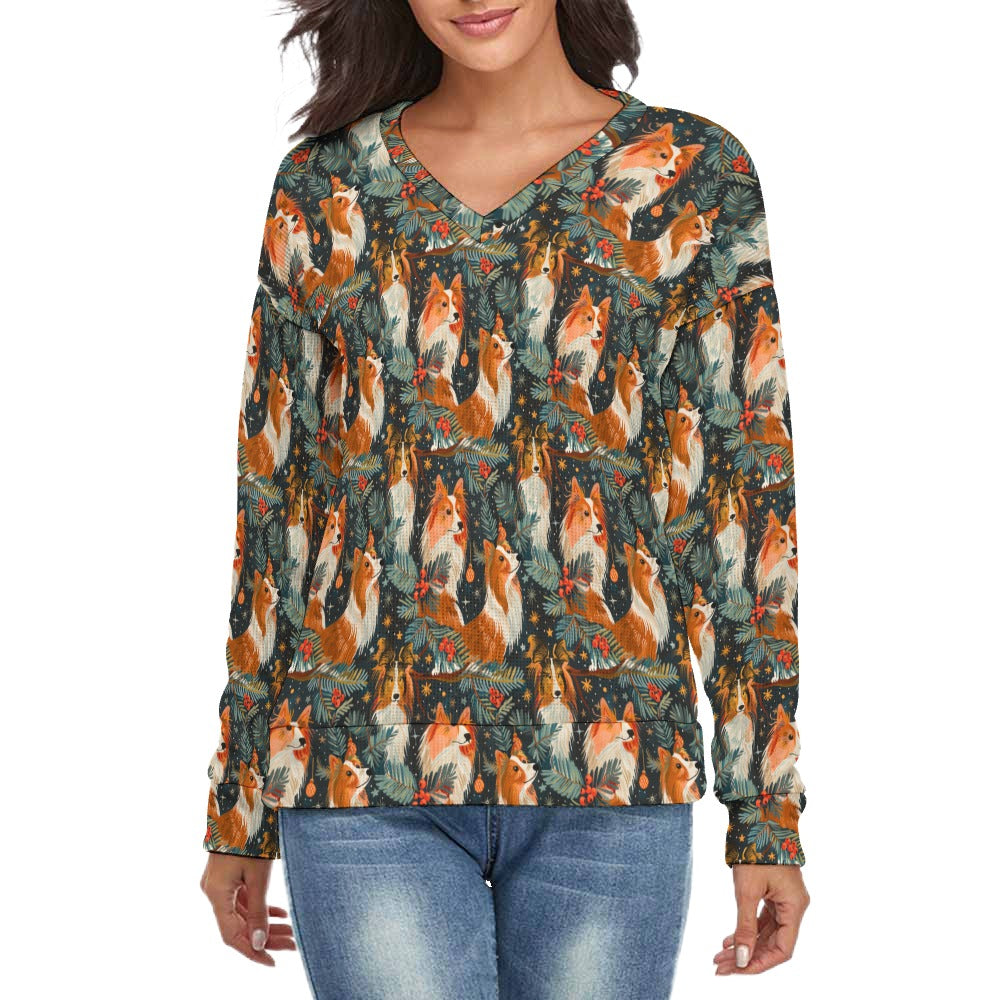 Festive Starlight Shelties Women's V-Neck Christmas Sweater