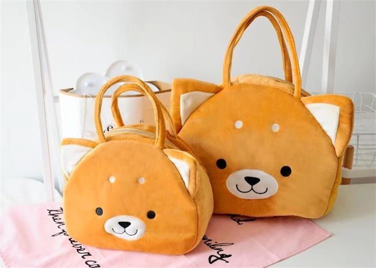 Made of super-soft plush fabric and featuring the most adorable smiling Shiba Inu design. Available in two sizes including Small, ideal to carry a small tablet, notebooks, a change of clothes, small water bottles, lunch box, children's toys, and more.