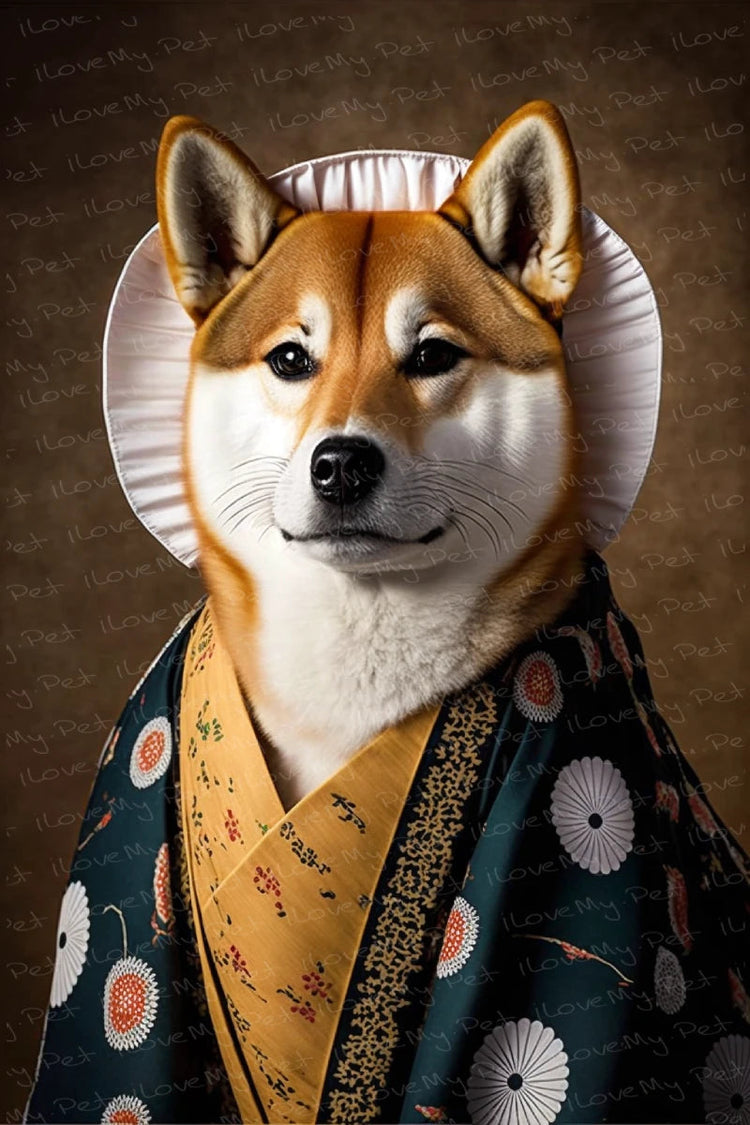 At the heart of this artwork lies the dignified Shiba Inu, a breed celebrated for its fox-like features and lively temperament. This majestic canine is not just portrayed as a pet but is revered as a historical figure, adorned in a traditional Japanese kimono.