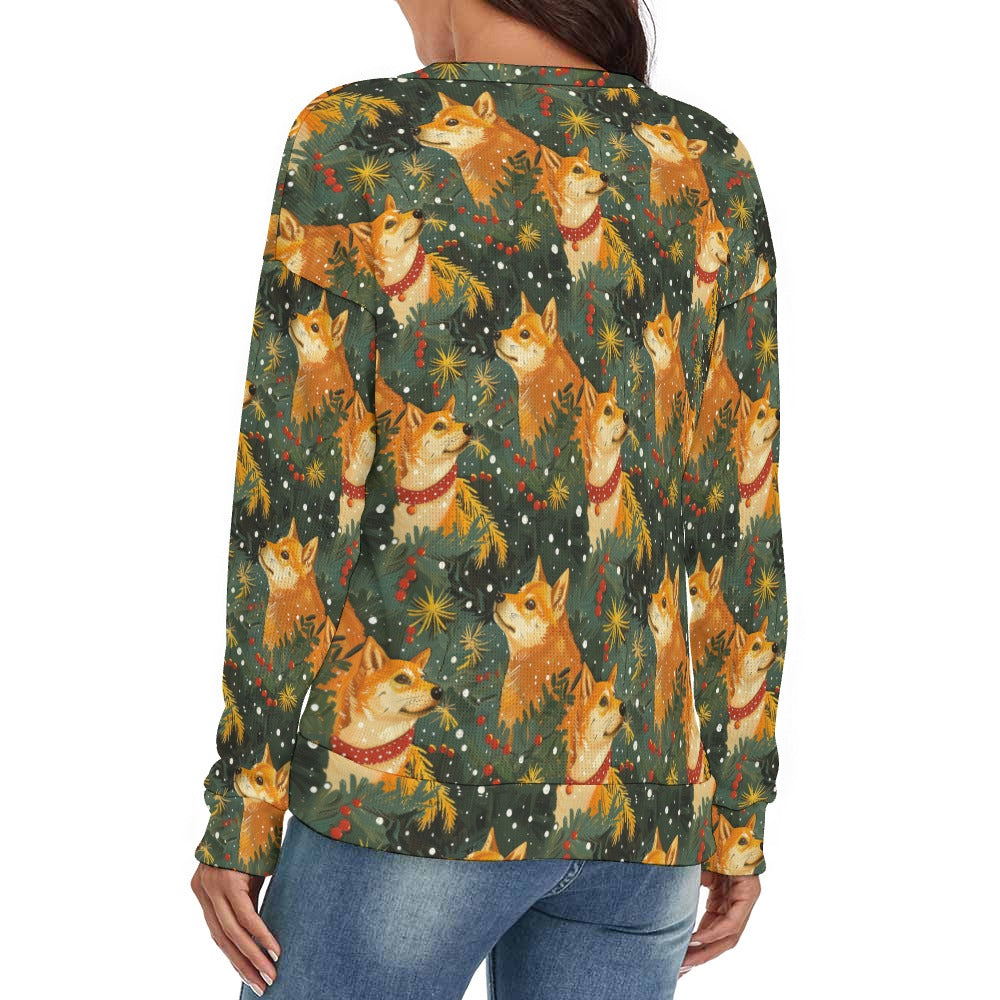 Wrap yourself in the warmth of the holiday spirit with our Festive Forest Shiba Inus Women's V-Neck Christmas Sweater.