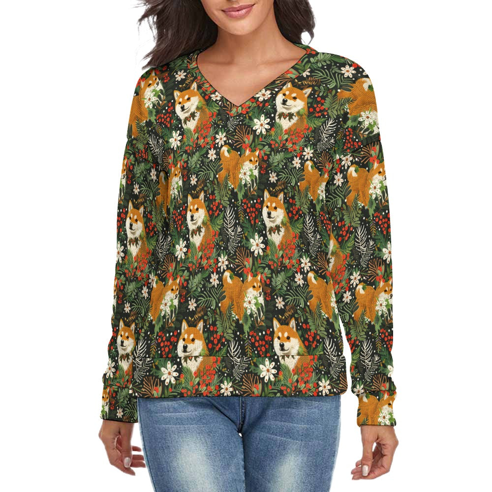 Midnight Frolic Shibas Women's V-Neck Christmas Sweater