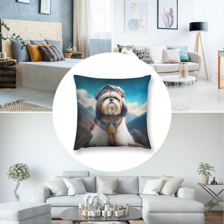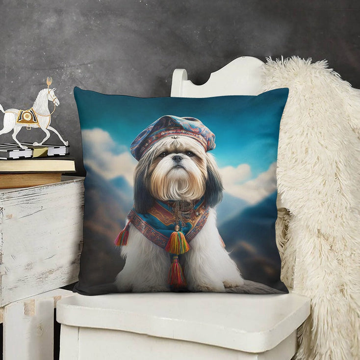This plush pillow case features a whimsical portrayal of the Shih Tzu, a breed esteemed for its historic connection to Chinese royalty. Adorned in luxurious attire reminiscent of the opulent fabrics and intricate designs of historic Asian garments, this regal canine is set against a backdrop that evokes the mist-shrouded, rolling hills of Tibet.