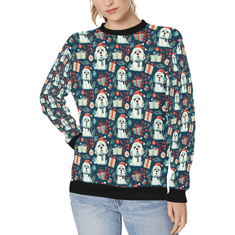 This festive sweatshirt features adorable Shih Tzus adorned with jolly Santa hats. Amidst a dark blue backdrop, wrapped gifts, ornaments, and pine needles create a rich tapestry of holiday cheer.