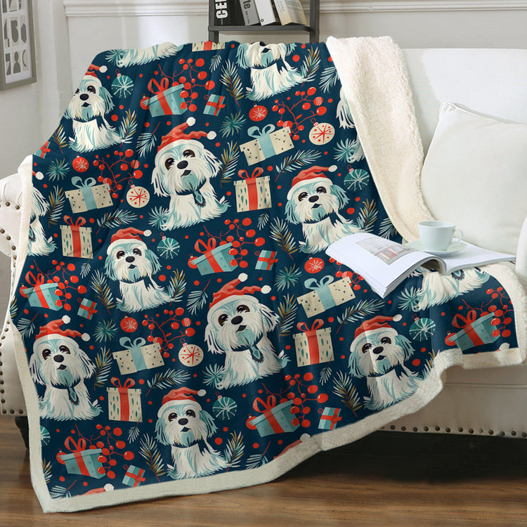 Amidst a dark blue backdrop, Shih Tzus steal the spotlight, each adorned with a jolly Santa hat. This blanket is a constellation of holiday motifs, with wrapped gifts, ornaments, and pine needles creating a rich tapestry that evokes the joyous spirit of Christmas.