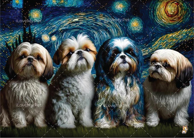 This delightful Shih Tzu art poster is perfect for any Shih Tzu lover looking to add some adorable and unique Shih Tzu decor to their home or office space. This Shih Tzu poster features a stunning detailed illustration of four fluffy white Shih Tzus gazing up at the stars in the night sky, creating an atmosphere of peace and tranquility.