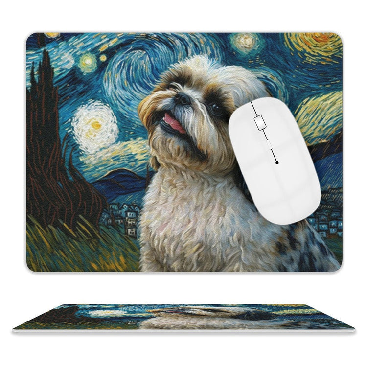 A fusion of artistic brilliance inspired by Vincent van Gogh's "Starry Night" and the graceful charm of the Shih Tzu breed. This remarkable mouse pad transcends mere functionality, evolving into a masterpiece that honors the affectionate demeanor and luscious coat of the beloved Shih Tzu.