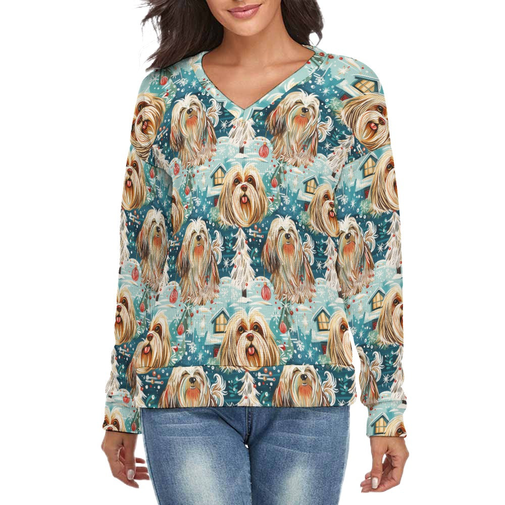 Winter Whiskers Shih Tzu Women's V-Neck Christmas Sweater