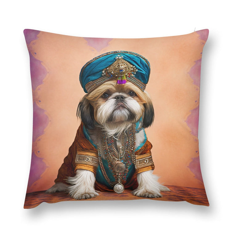 This plush pillow case, featuring a whimsical depiction of a Shih Tzu adorned in royal garb, brings a touch of regal splendor to your home decor. The luxurious coat and noble demeanor of the Shih Tzu is captured in an artwork that transports viewers to an era of opulence reminiscent of the lavishness of the Ottoman Empire.