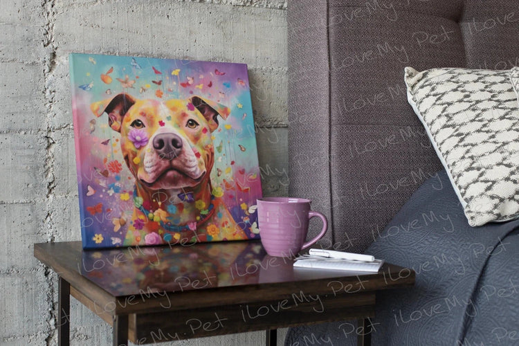 Embrace the enchanting beauty of "Floral Fantasy Pit Bull", a wall art poster that brings the magical essence of nature and the endearing spirit of Pit Bulls into your home.