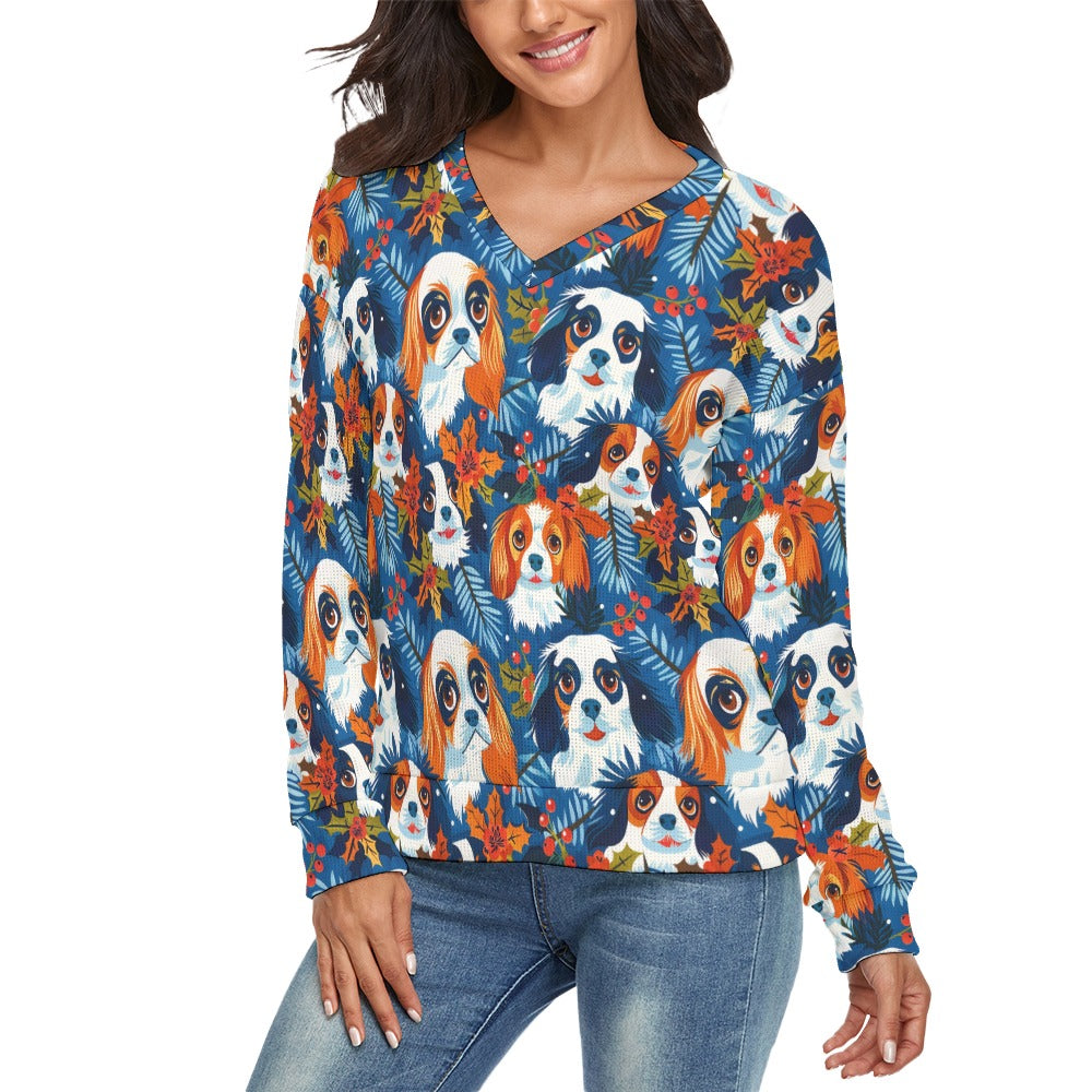 Autumn’s Adornment King Charles Spaniels Women's V-Neck Christmas Sweater