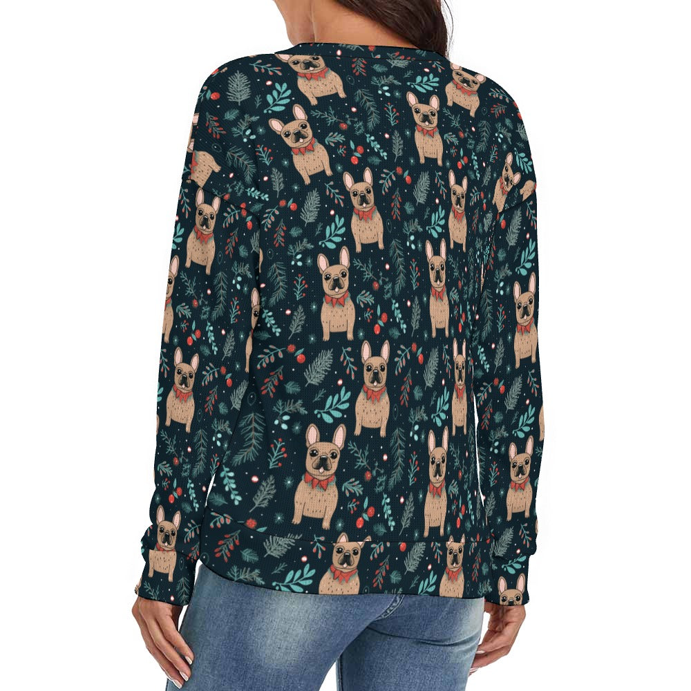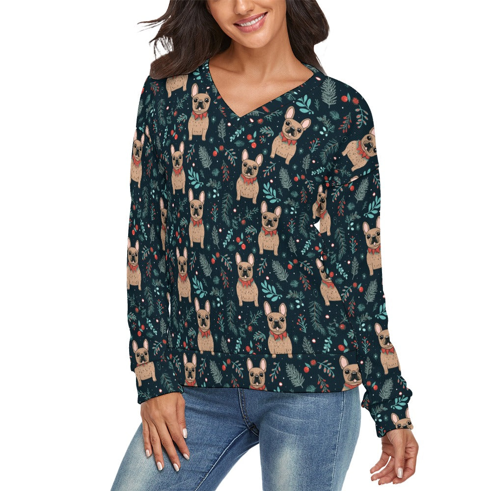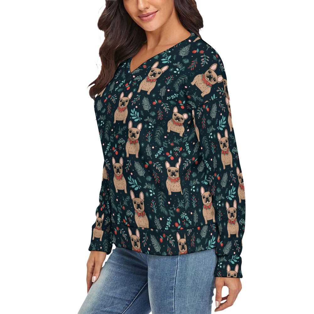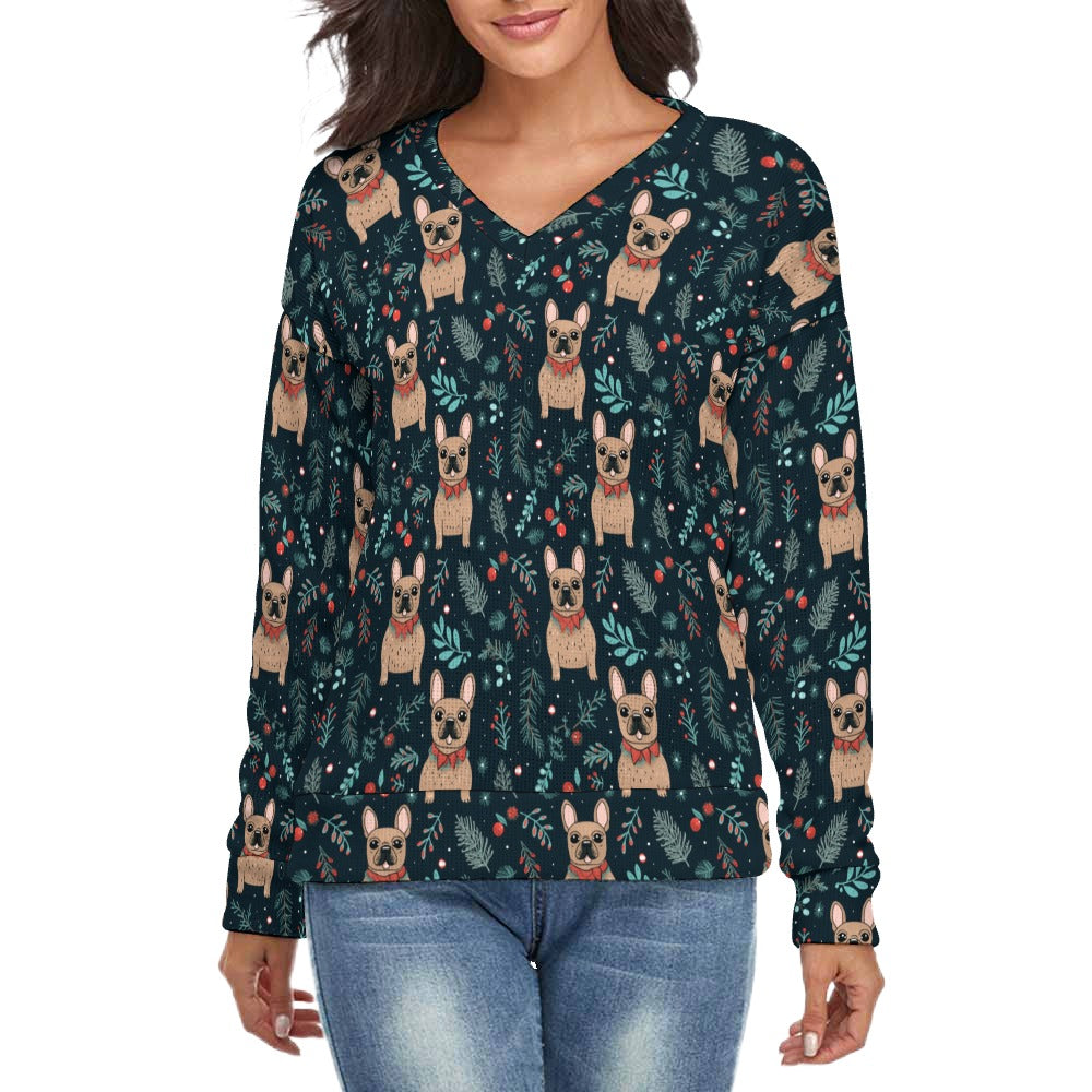 Celebrate the joy of the holiday season with our Festive Fawn French Bulldog Forest Women's V-Neck Christmas Sweater!