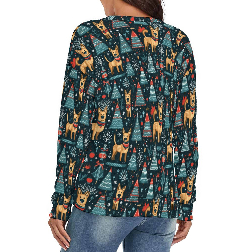 This delightful sweater features a vibrant tapestry of playful Belgian Malinois, frolicking among wintry pines, bringing warmth and cheer to your holiday gatherings.