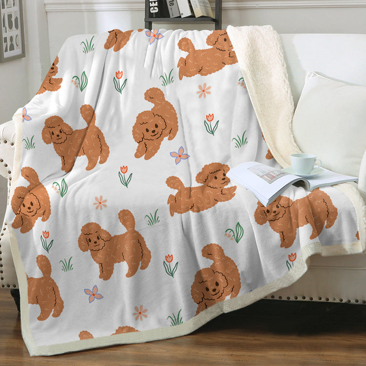Designed with both Doodles and people in mind, this cozy blanket is the epitome of comfort and style. It features an adorable brown Doodle frolicking among a vibrant garden of red, blue, and white flowers. Much like Doodles themselves, known for their playful and friendly nature, this blanket invites happiness and warmth into your home.