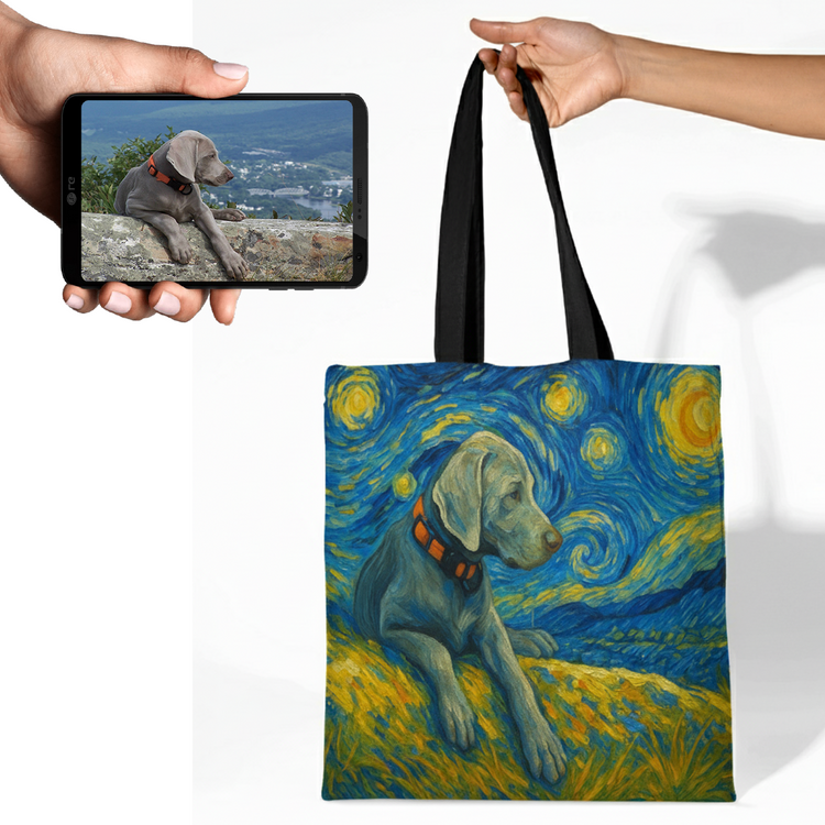 Celebrate your love for your Weimaraner with our Personalized Starry Night Artwork Custom Dog Canvas Tote Bags. These unique bags are more than just accessories; they are heartfelt expressions of your bond with your furry friend.