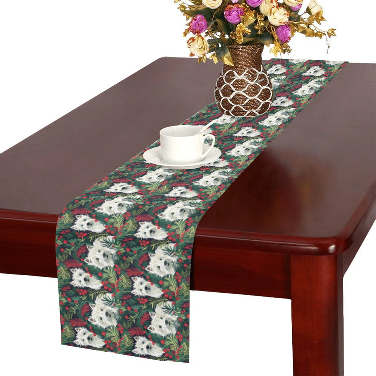Amid a tapestry of emerald greenery, the bright-eyed West Highland White Terriers are like living ornaments, enhancing the holiday cheer. Their distinct personalities, from inquisitive to content, are beautifully captured, making this table runner a sentimental gift.