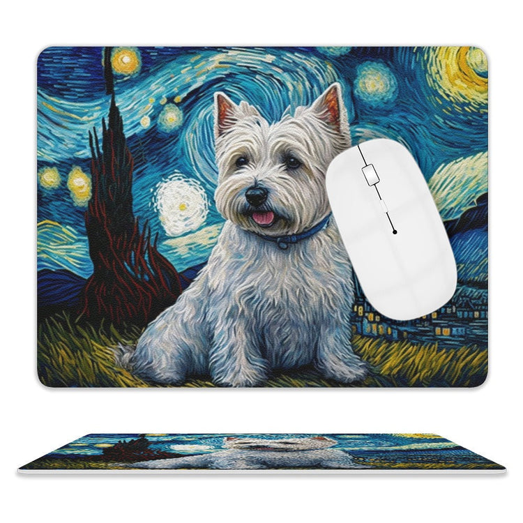 This captivating mouse pad showcases a West Highland White Terrier, its luminous eyes and striking white coat set against a mystical backdrop reminiscent of Vincent van Gogh's "The Starry Night".