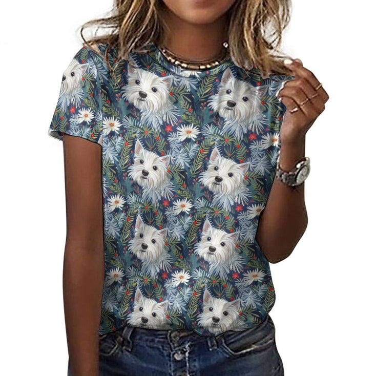 Celebrate the season with our Winter Garden Westie Christmas Women's Cotton T-Shirt, a heartfelt tribute to your beloved West Highland White Terrier.