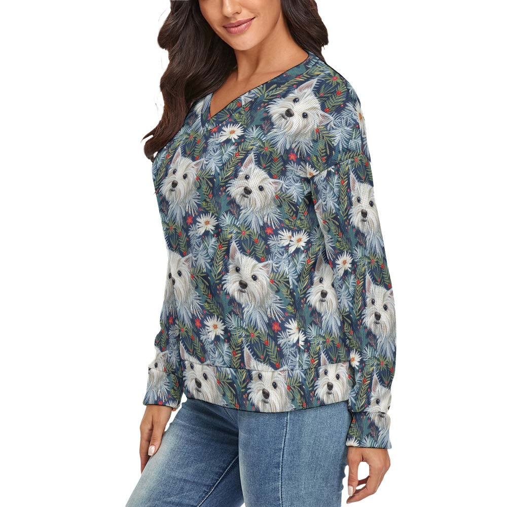 Embrace the festive spirit with our Winter Garden Westie Women's V-Neck Christmas Sweater, a perfect blend of warmth and style for every West Highland White Terrier lover.